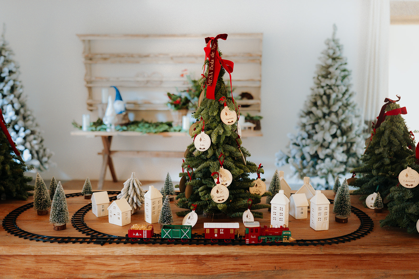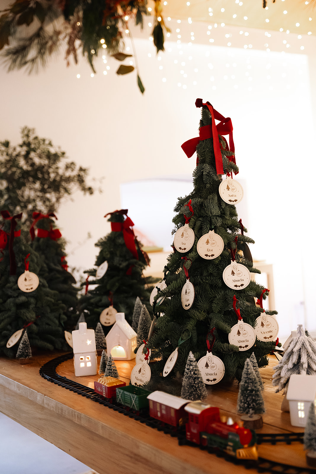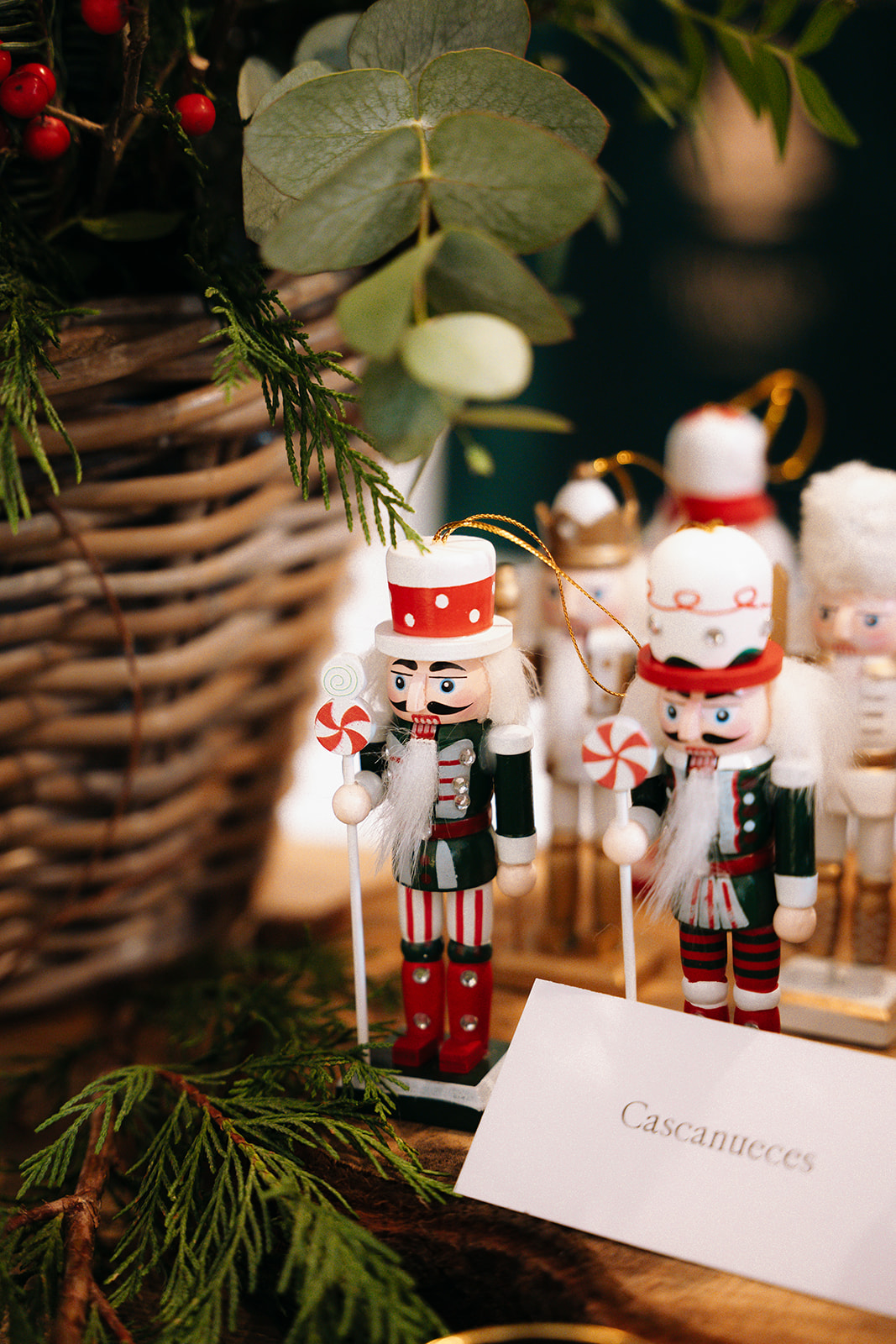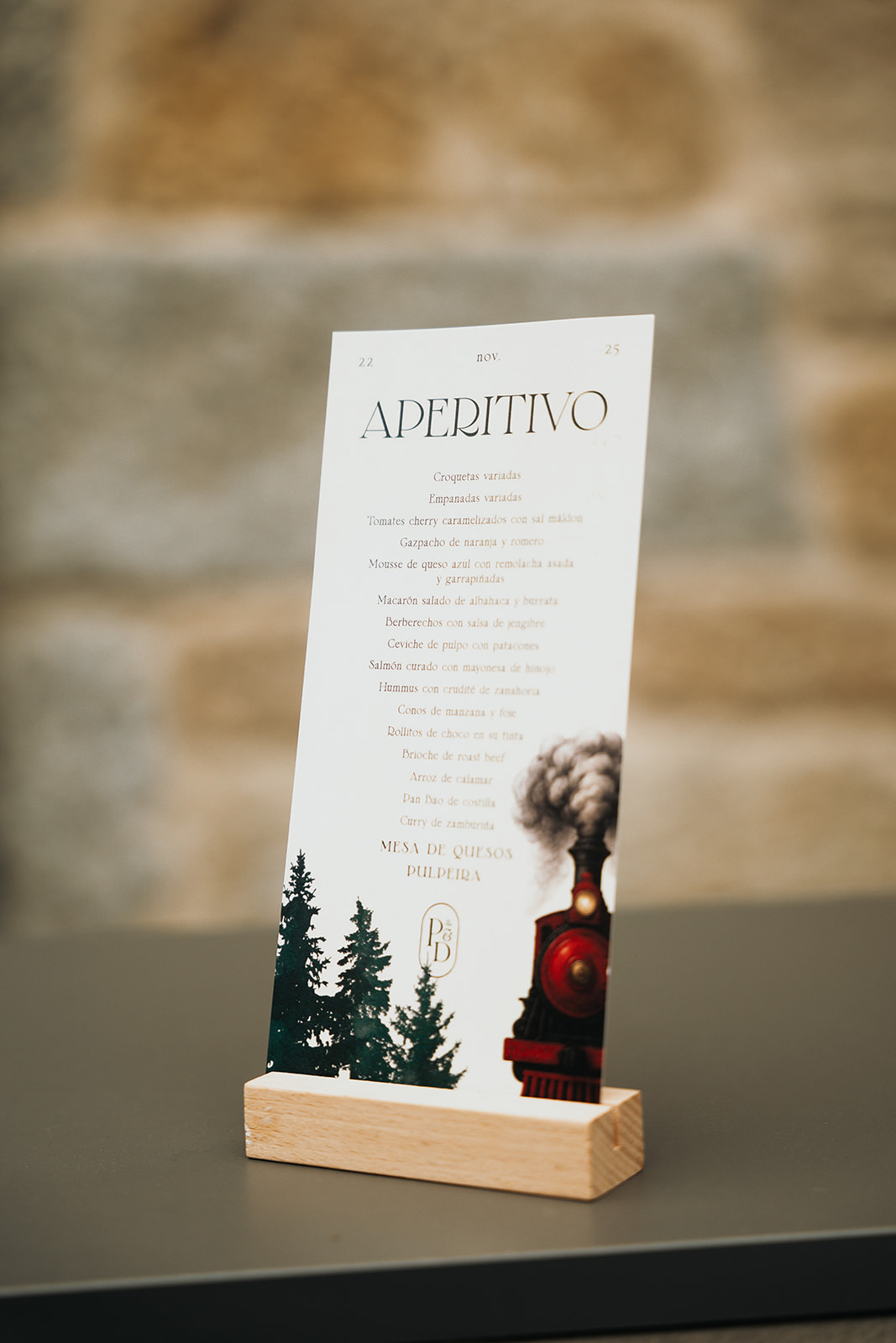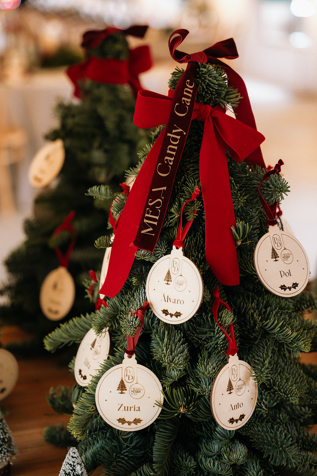 El seating plan fue, sin duda, uno de los puntos clave de la boda: un tren navideño que funcionaba de verdad (sí, se movía). Y, como no podía faltar en una boda de invierno en Galicia, montamos una mesa de dulces navideños llena de clásicos reinventados que desaparecieron en tiempo récord.