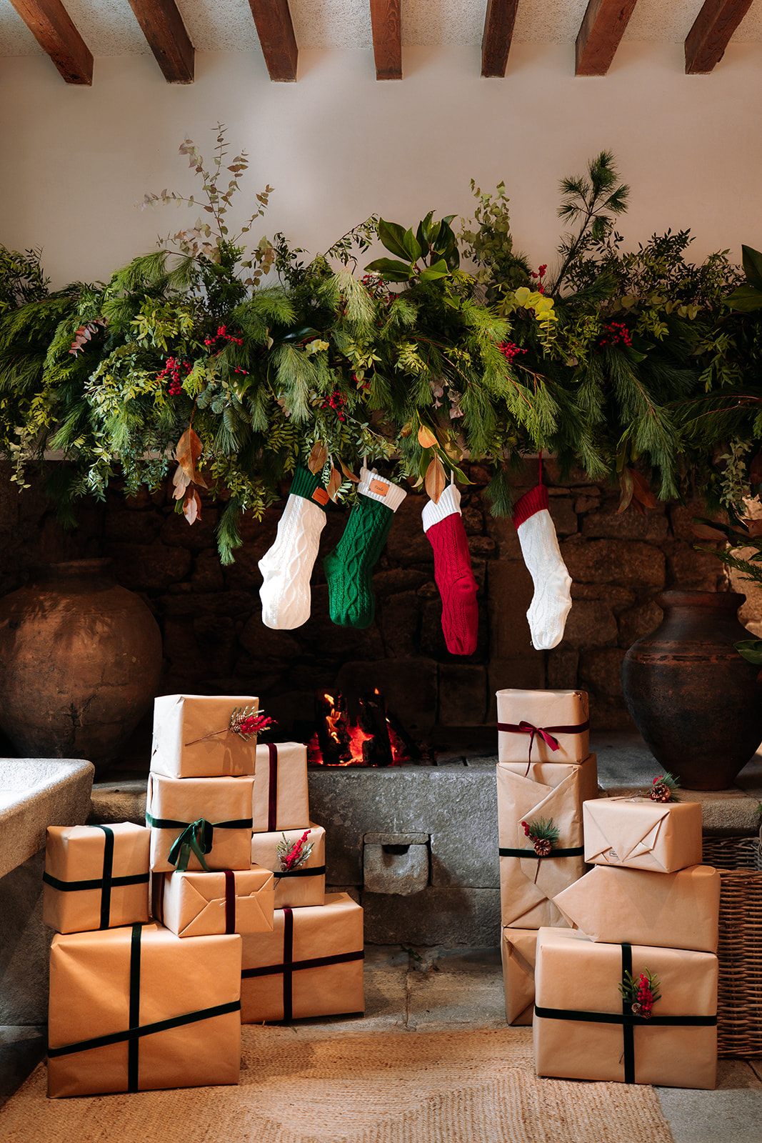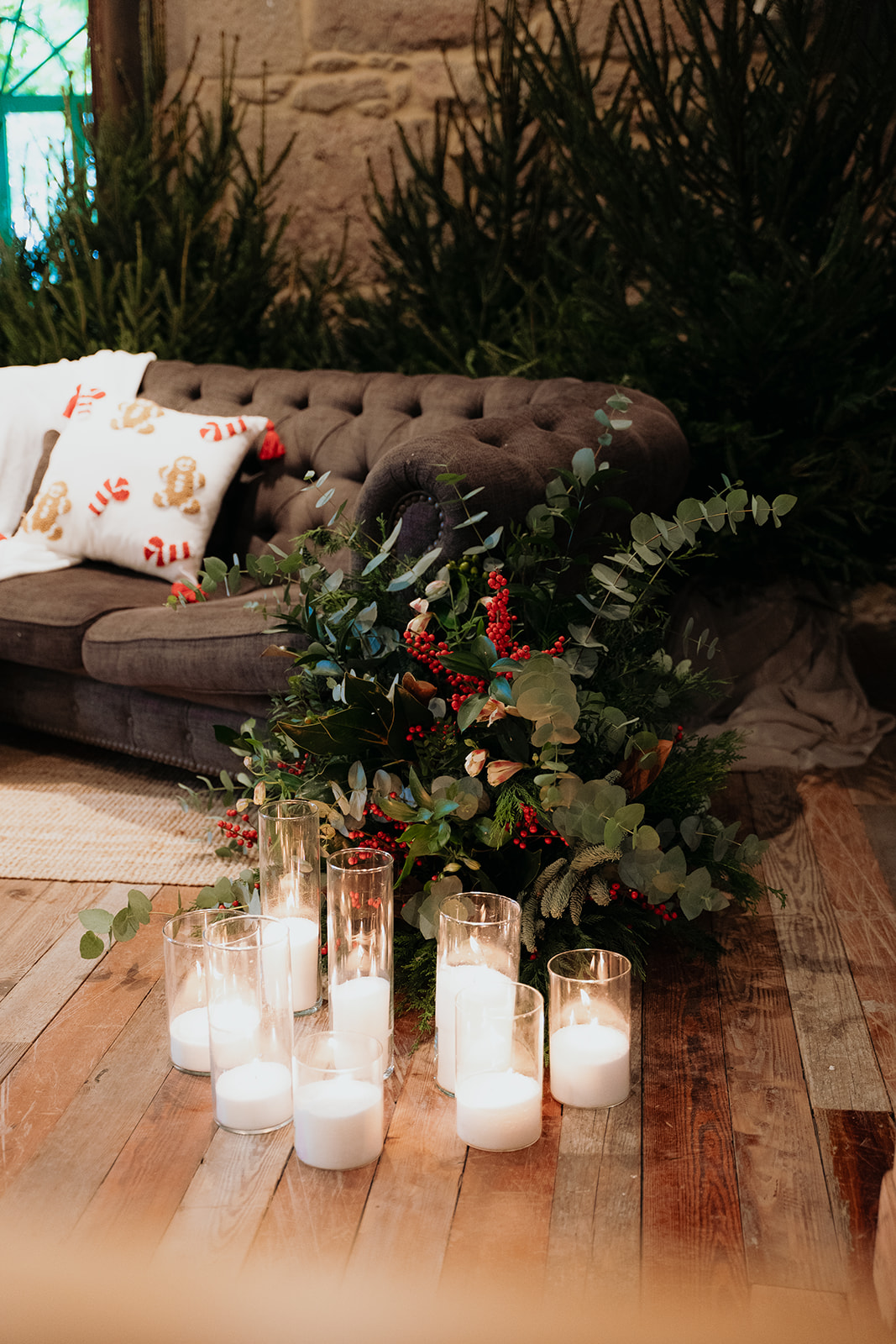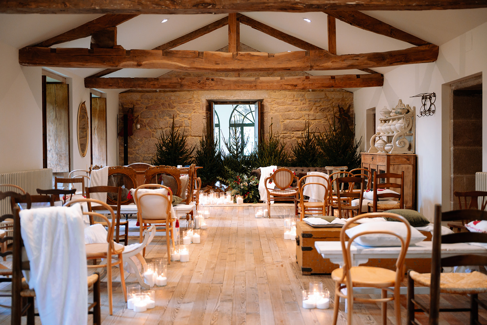 Diseñamos la decoración de todo el pazo como si la Navidad se hubiese instalado allí para quedarse. Desde una mesa de regalos navideños con detalles personalizados y postales para los invitados, hasta una decoración cálida y festiva que encajaba a la perfección con la arquitectura del pazo y el entorno gallego.